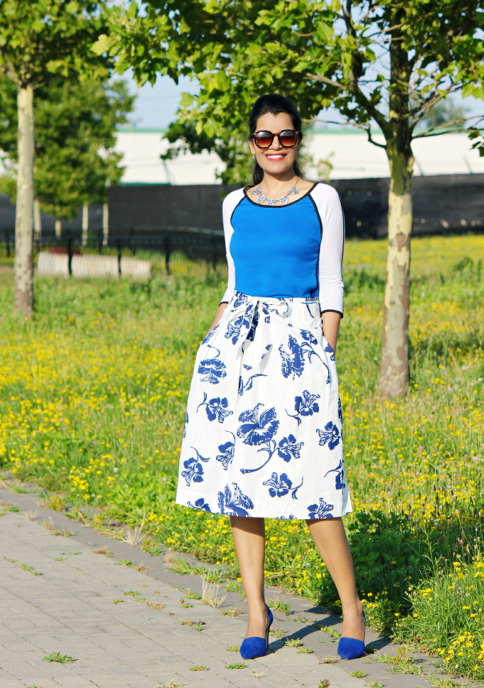 In Kerala, the southern state of India, my mother-in-law has a beautiful garden full of tropical flowers & plants. Hibiscus - one of the signature Kerala flowers -bloom in abundance there; in bright red, pale yellow, delicate peach and even blushing pink and lilac. This Zara skirt reminds me of the Kerala beaches, sea breeze and 'Amamma's garden'. Summer in its full glory!